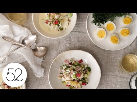 The first is from Kachka: A Return to Russian Cooking by Bonnie Frumkin Morales and Deena Prichep, an ode to Soviet cuisine in all its glory. Behold, Okroshka, a crunchy, creamy kefir soup that’s best served cold. It's the tart and tangy dish your dinner's been waiting for and is as simple as boiling potatoes. Watch it come together below.